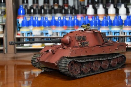 タミヤのキングタイガーを再塗装しました。 カラーリングは以前と変わらず下地色のオキサイドレッド。 ファレホではジャーマンレッドブラウン。 今回はこの塗料で再塗装をしました。 濃い色味が良い感じです。 砲身は前回のキングタイガーのマネをしてパンツ…